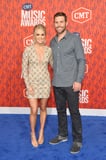 Carrie Underwood knows the recipe for a dazzling red carpet outfit. The 36-year-old singer stepped out for the CMT Awards on June 5 with husband Mike Fisher, and chose a pastel Michael Cinco dress for the occasion. The jewel-encrusted minidress featured an eye-catching plunging neckline, along with delicate embroidery and beading throughout - perfect for a record-setting award-winner, like Carrie. She paired the outfit with sparkling gold Diamanté sandals, dangling Djula starburst earrings, and of course, her ginormous engagement ring. Check out even more photos of her ensemble from all angles, and then check out her performance of "Southbound" from the show.