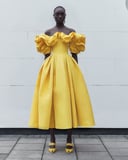 The first look - an off-shoulder corset dress in a vibrant shade of yellow - stands out as a brilliant re-creation of archival silhouettes. A corset dress with silver-metal detailing and an asymmetric drape skirt in pastel pink recalls the vintage slip dress Miley Cyrus wore on "Late Night With Seth Meyers" last month. Each piece proved Burton's virtuosity and mastery of the British label's house codes.